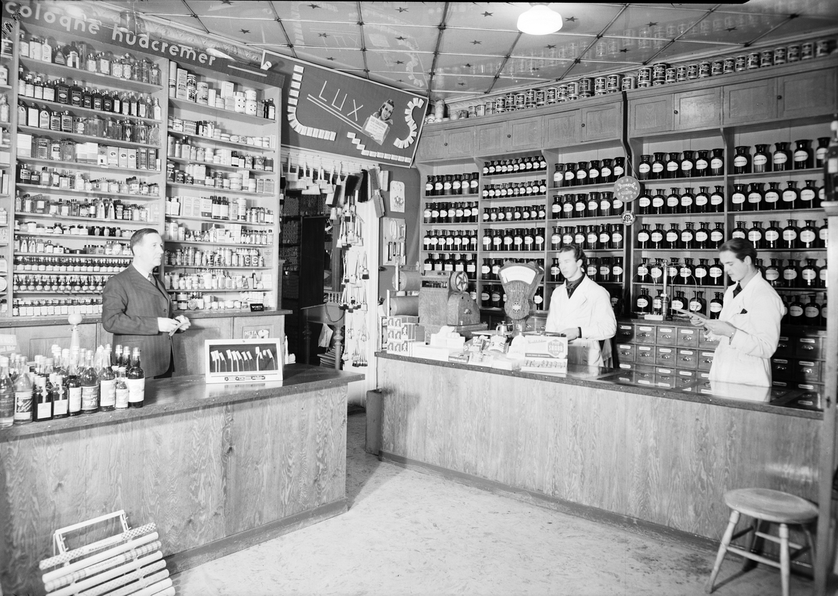 Holms Färghandel. Till vänster står Gustaf Holm och på andra sidan Erik Eriksson och Isaksson.