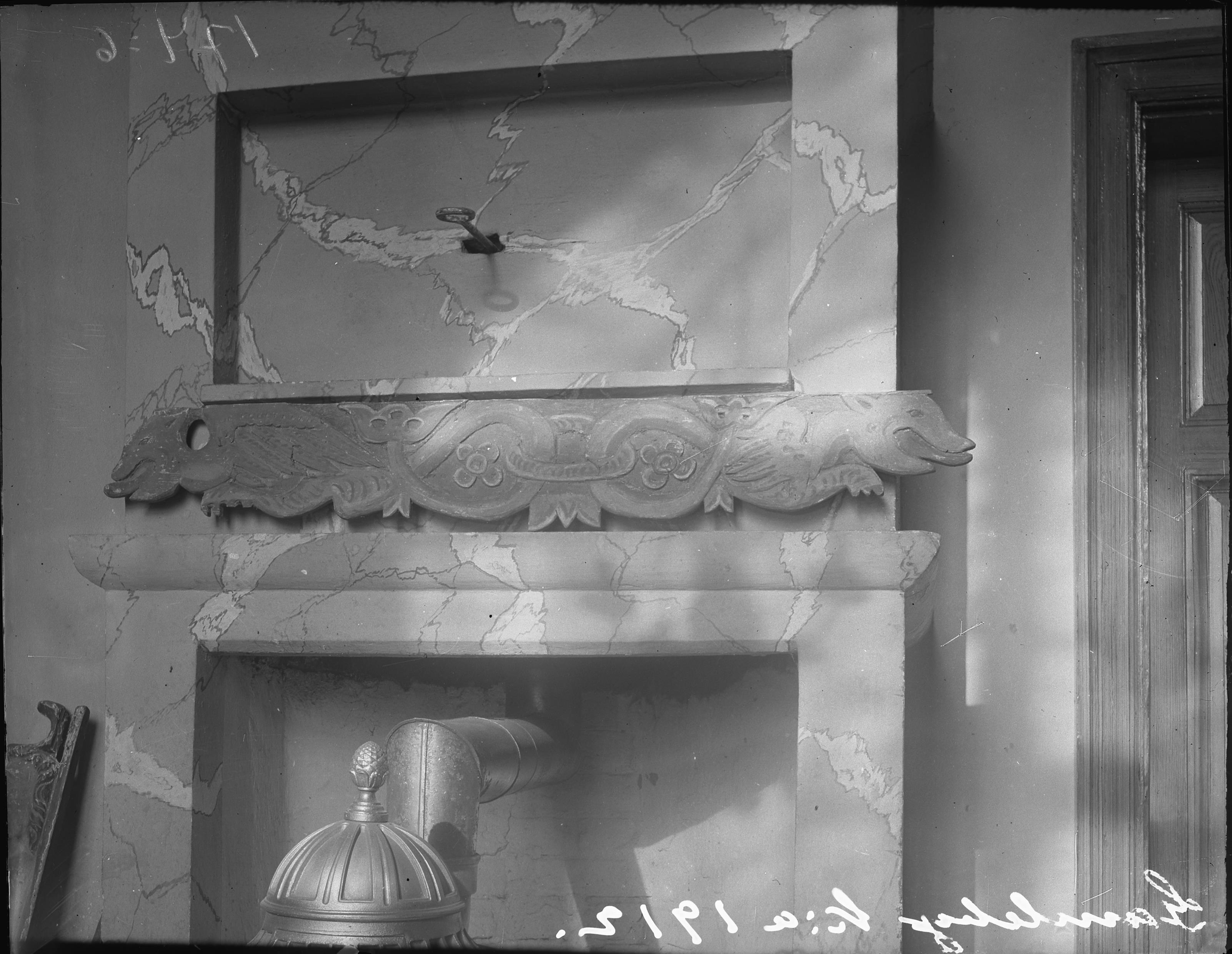 Värmekamin med utsmyckning på frisen.