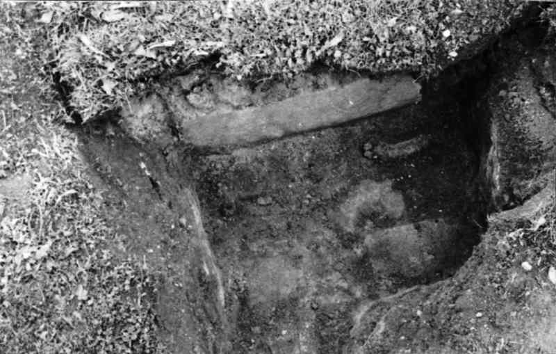 Rester av klosterkyrkan. Hörnet mellan södra längans sydmur och västra längans öster mur. I provgropens botten skymtar golvtegel. Bildens övre kant mot söder.
