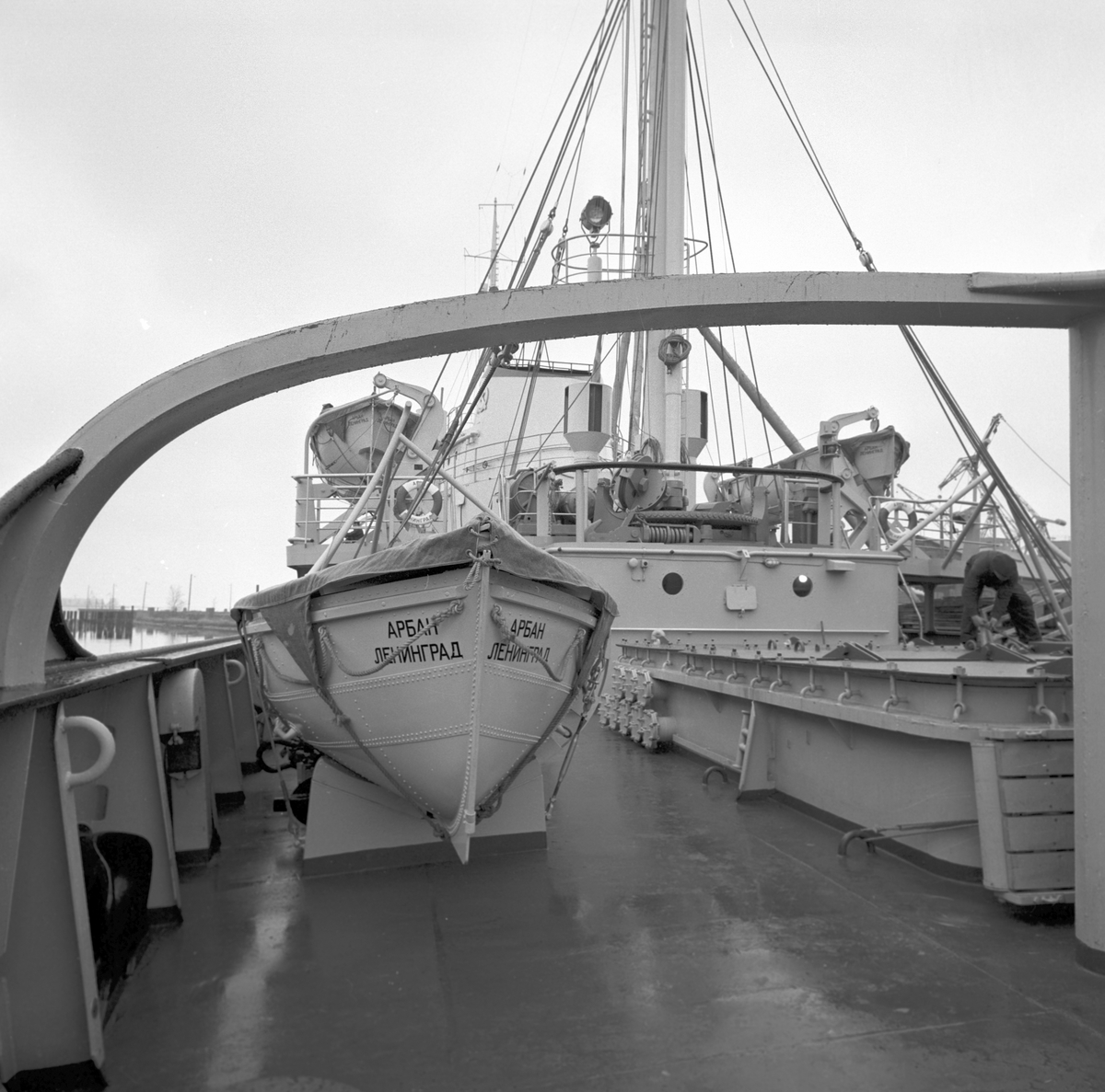 Titel: Ombord på fartyget. Gävle Varv anlades 1873. Efter en konkurs 1921 bildades Gefle Varfvs och Verkstads Nya AB, som bland annat tillverkade oljecisterner och utrustningar till pappersmassefabriker. På 1940-talet återupptogs skeppsbyggeriet. På 1950-talet, då Korsnäs AB ägde varvet byggdes flera högsjöfartyg. I början av 1960-talet byggde varvet den ponton som regalskeppet Wasa skulle placeras på vid bärjningen.