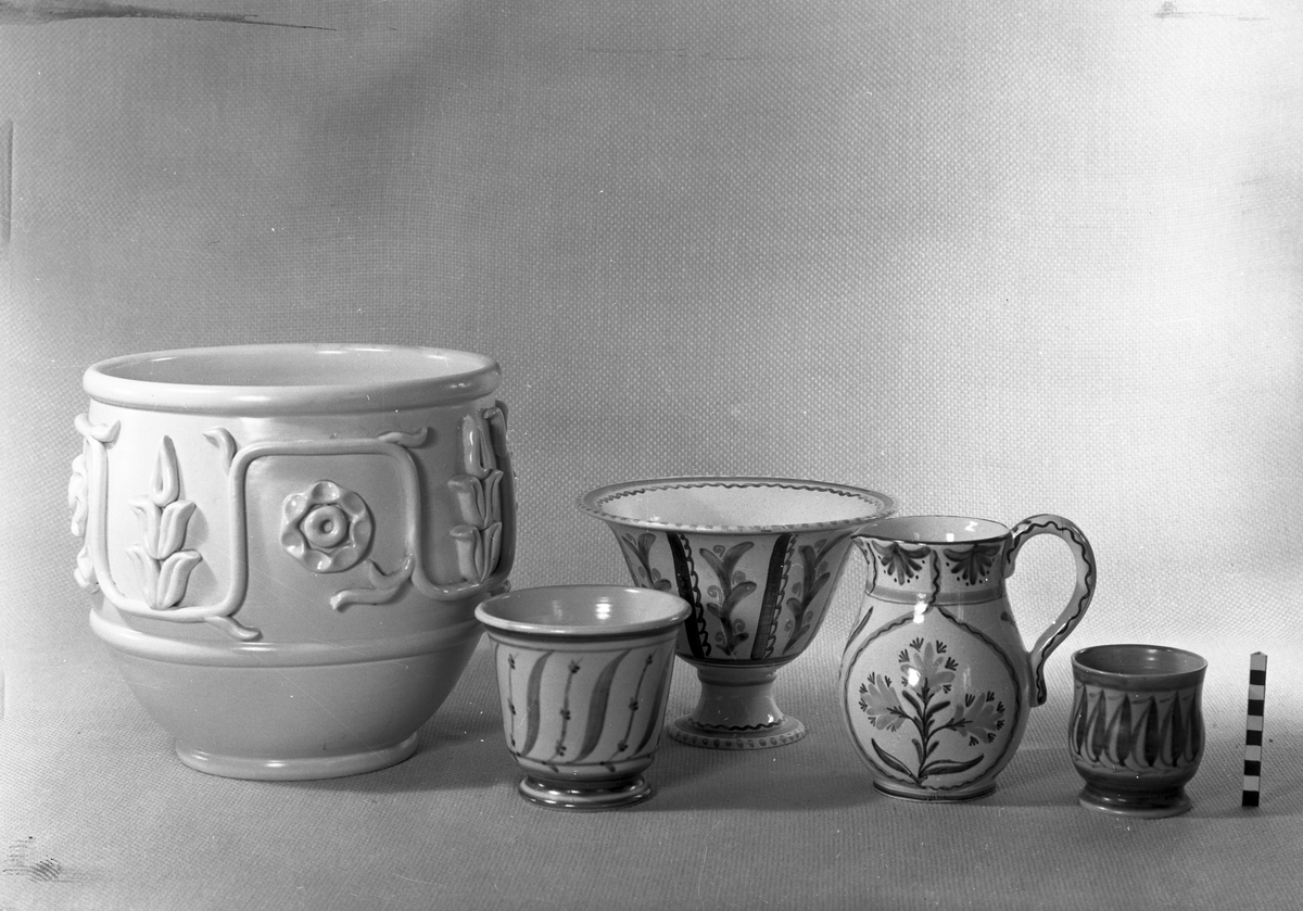 Husgeråd och prydnadsföremål. Ytterkrukor, skål och kanna. Bobergs Fajansfabrik AB.
