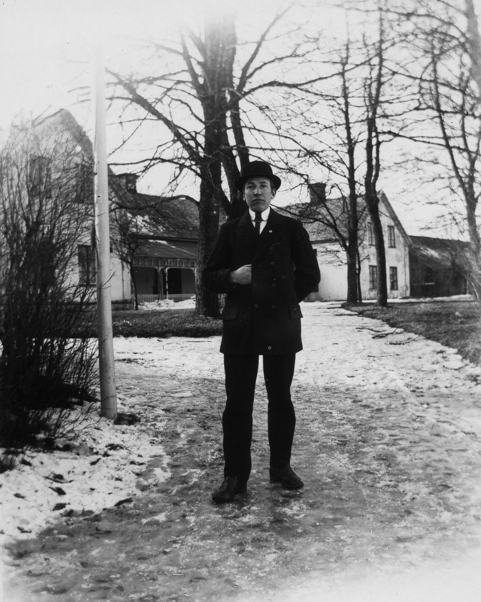 Man i trädgård.