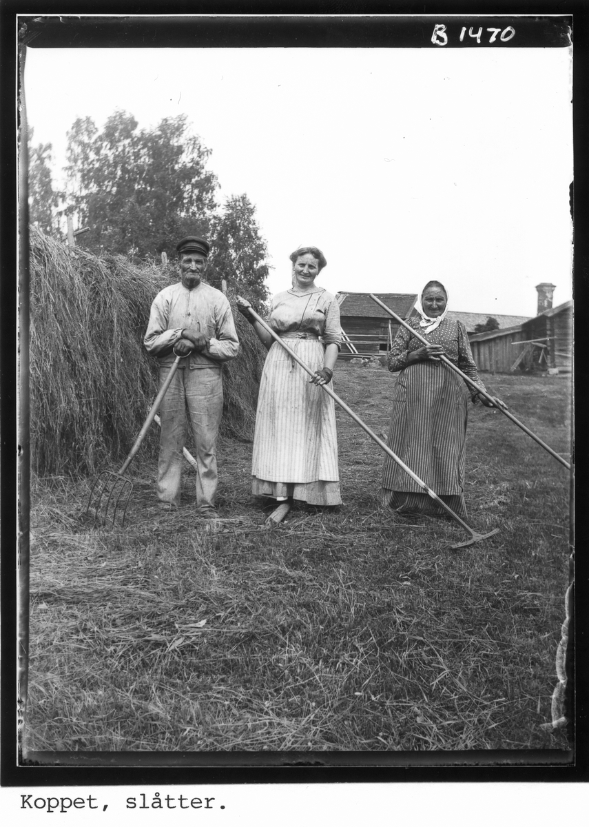 Hoppet, slåtter. Från vänster Jonas Larsson "Furbo Jon" med dottern Hanna och fru Greta (Elis Erikssons morfar och mormor samt moster).