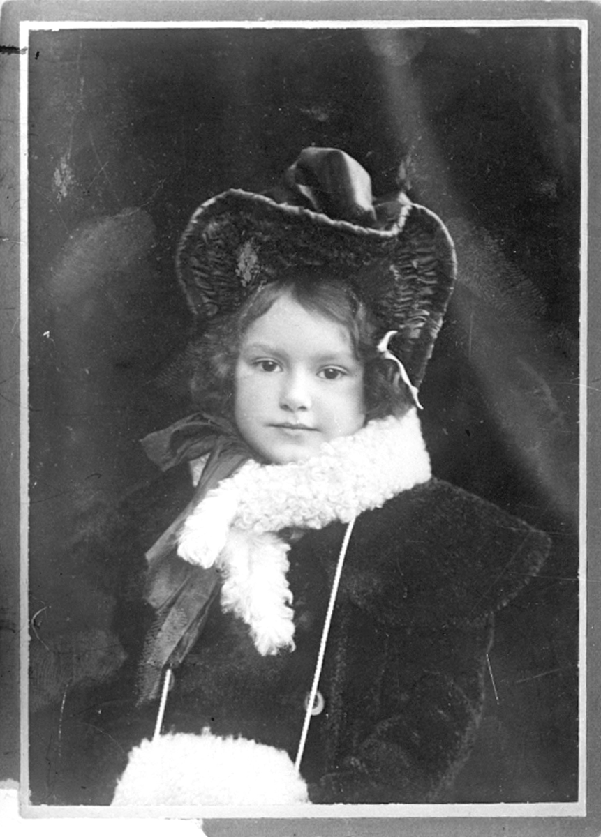 Kopia av gammalt kort av flicka i vinterdräkt. December 1944. Forstmästare Y. Christiansson.