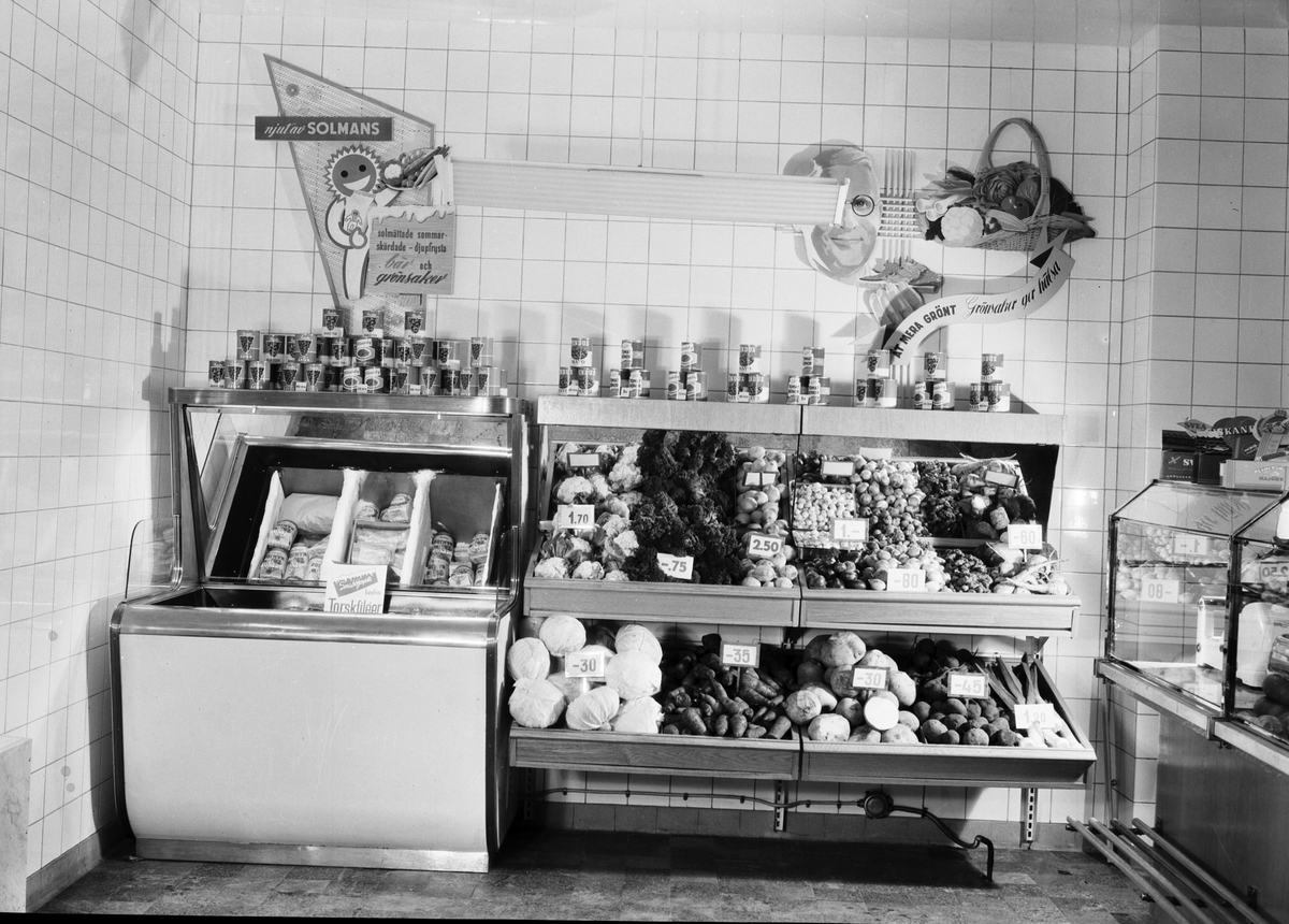 Konsum Alfa. Datum 26 oktober 1950. Interiör av butiken på Gustafsgatan. Kyldisken var ny.