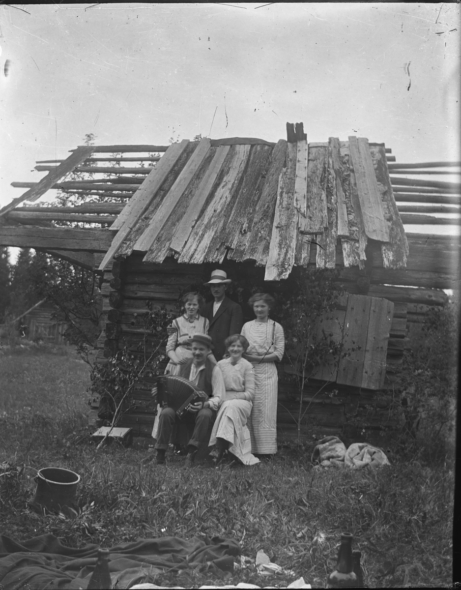 Det här är troligtvis från Ytterharnäs, där familjen Brundin hyrde ett sommarställe av en fiskare. Personerna från vänster: Elna och David Brundin, okänd kvinna, Elnas syster Gertrud med man eller fästman Carl Nordgren med dragspelet.
