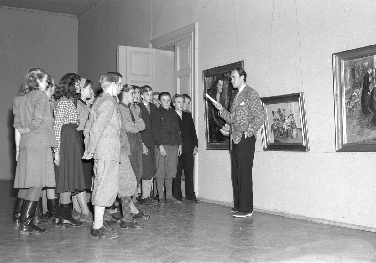 Konst i skolan. Skolungdomar beser utställning på Stadshuset. 3 november 1948. Reportage för Gefle Dagblad och Arbetarbladet.