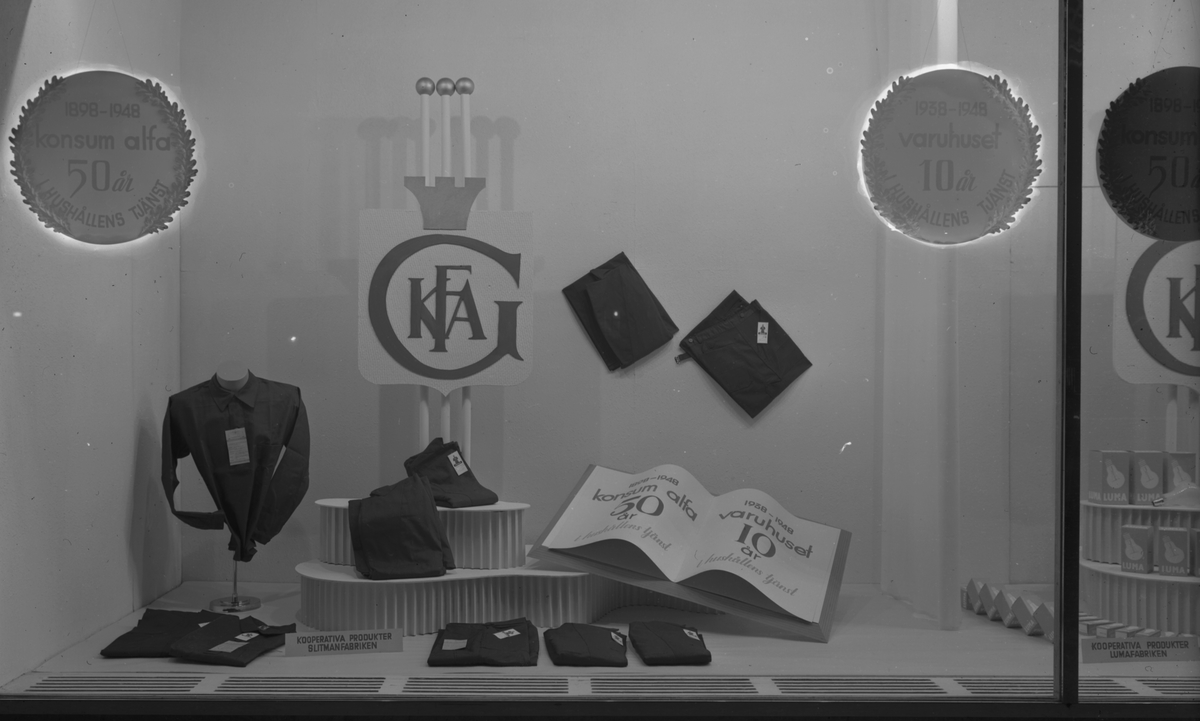 Titel: Konsum Alfa, skyltfönster "Konsum Alfa, 50 år; Varuhuset, 10 år"