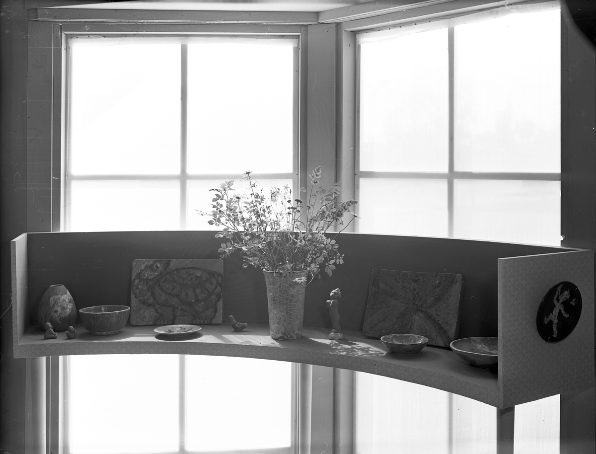 Detalj av formgivare och keramiker Maggie Wiboms monter vid Jubileumsutställningen i Gävle 1946. Utställningen celebrerade stadens 500-årsjubileum och byggdes upp under sommaren på Gävle Travbana.