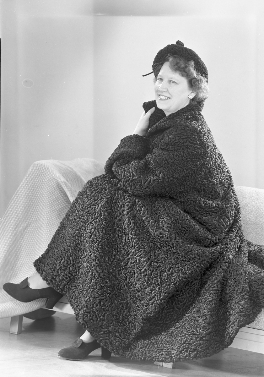 Titel: Pälskappa med hatt. L. Haglund & Co, med varumärket Elhå. Grundades som en affär för mössor, hattar och pälsvaror av Lars Haglund 1872.