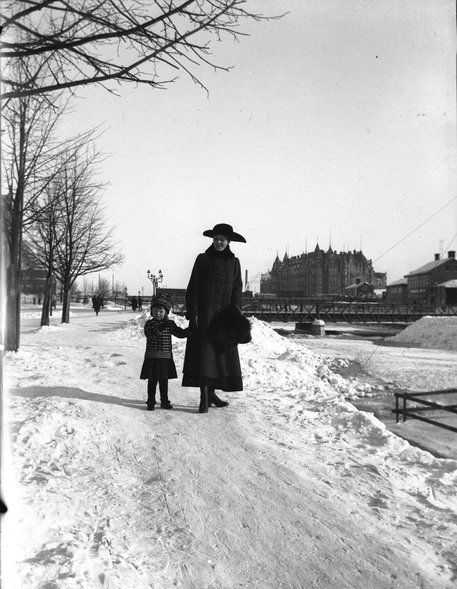 Här ses Ingeborg Malmberg, född Olsson, tillsammans med Ingrid Brundin, ca 1915-1916. I bakgrunden syns Dalapalatset och Svängbron. Snön från Gävles gator och gårdar kördes med häst och släde och stjälptes ut i Gavleån, så man kunde gå över ån på snövallarna vissa år.