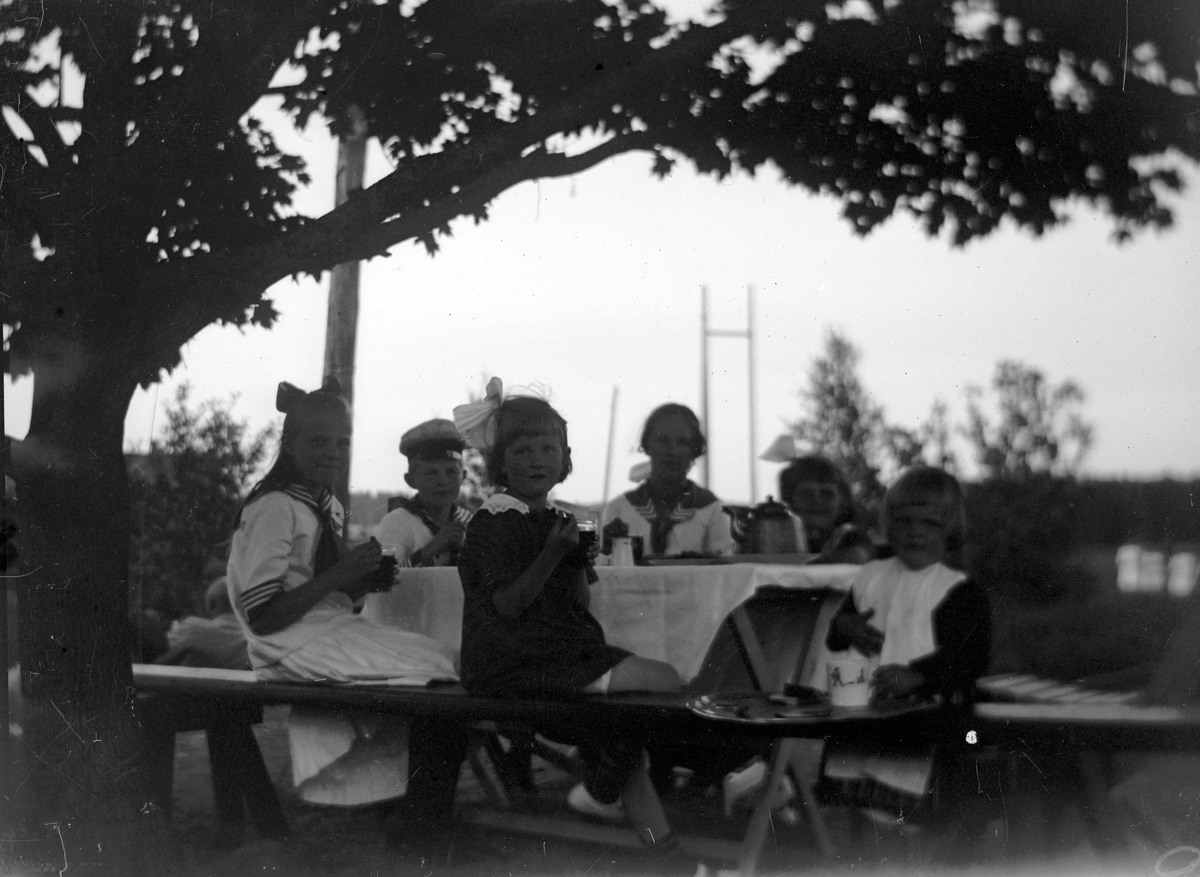Det här är antagligen i Hemlingby. Systrarna Brundin med Elnas kusiner, Anna Larsson till vänster och Ellen Larsson, kvinnan i mitten. Ellen anlitades ofta som hjälp till Elna Brundin för att sköta barnen.