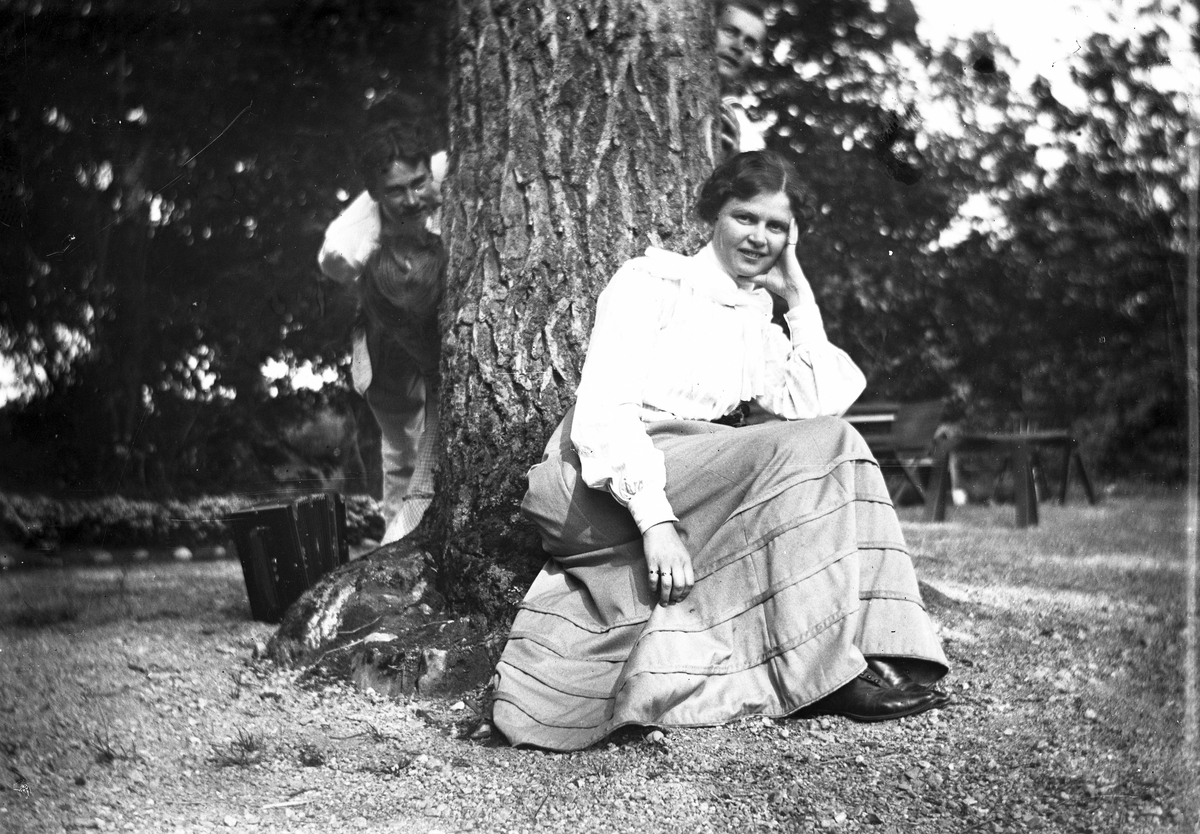 Kvinna sitter under trädet, männen tittar fram bakom trädet