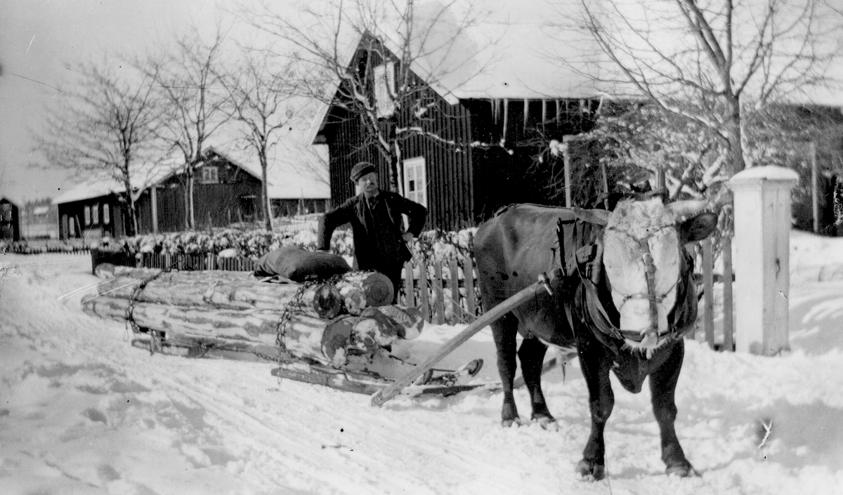 Timmerlass genom Axmarby. Sven Lindholm med sin tjur