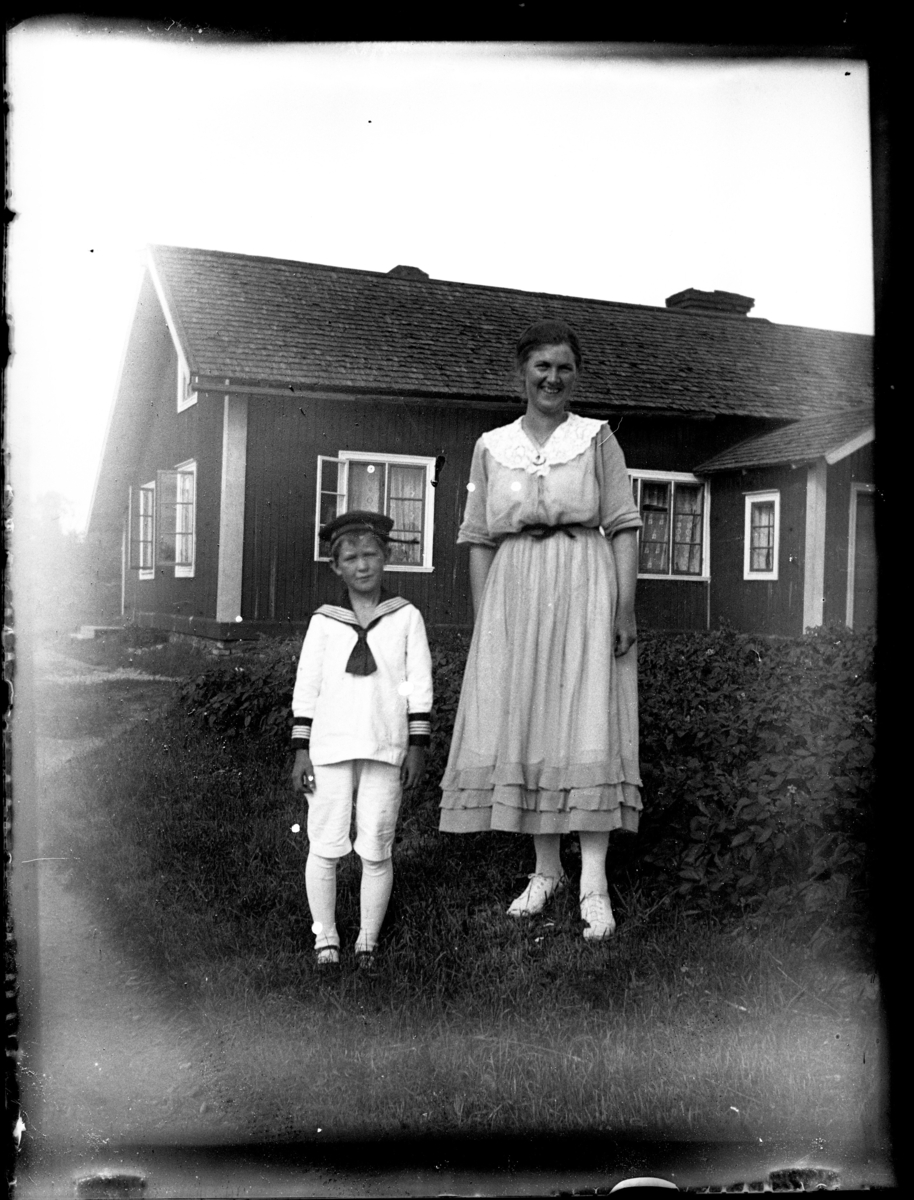 En kvinna och en pojke framför ett hus som sannolikt idag (2023) är Limö Café.