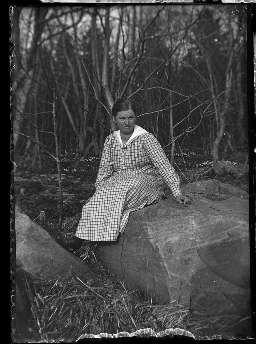 En kvinna sitter på en sten, klädd i rutig klänning.