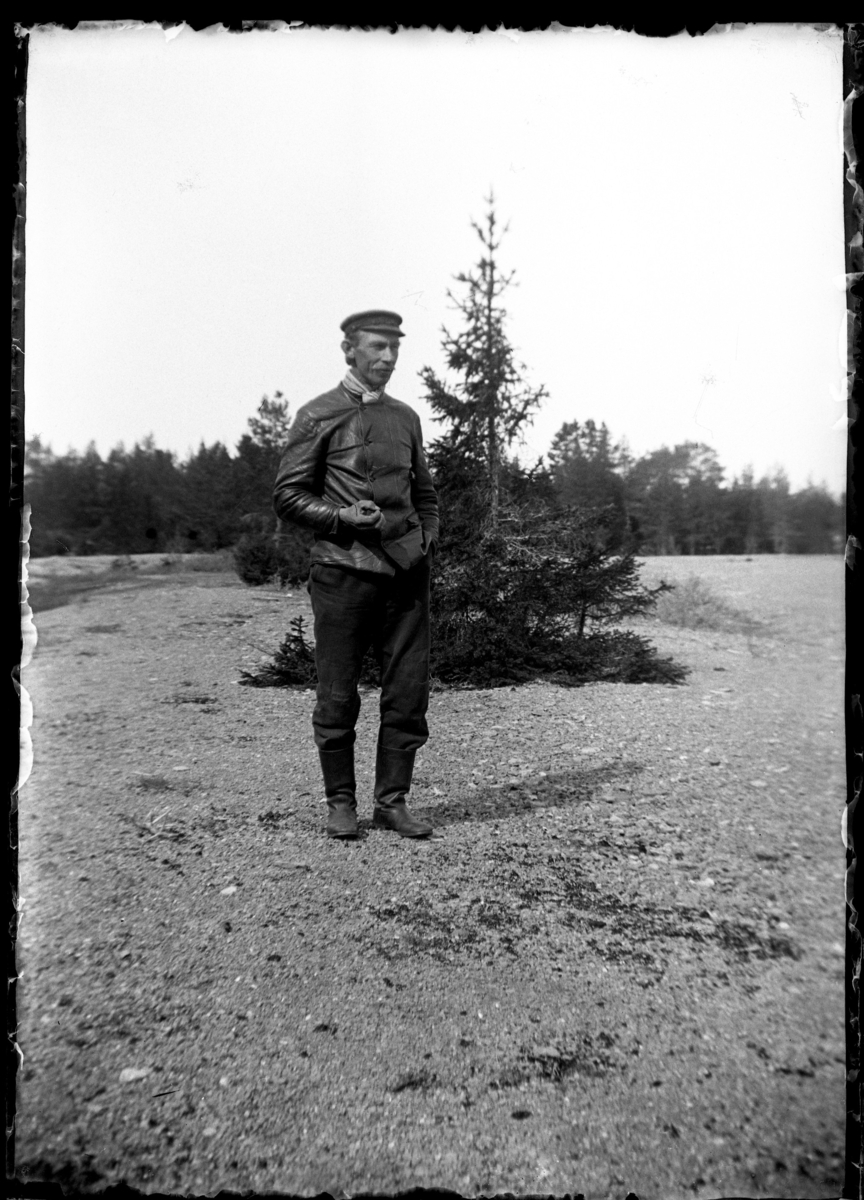 Porträtt av en man, klädd i skinnjacka och stövlar.