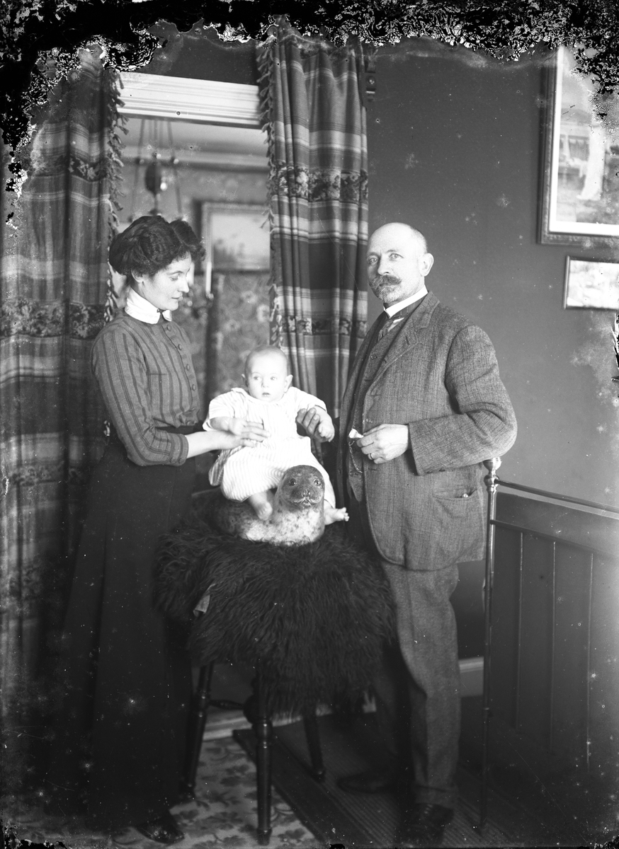 Familjeporträtt. Barnet sittande på en uppstoppad säl.