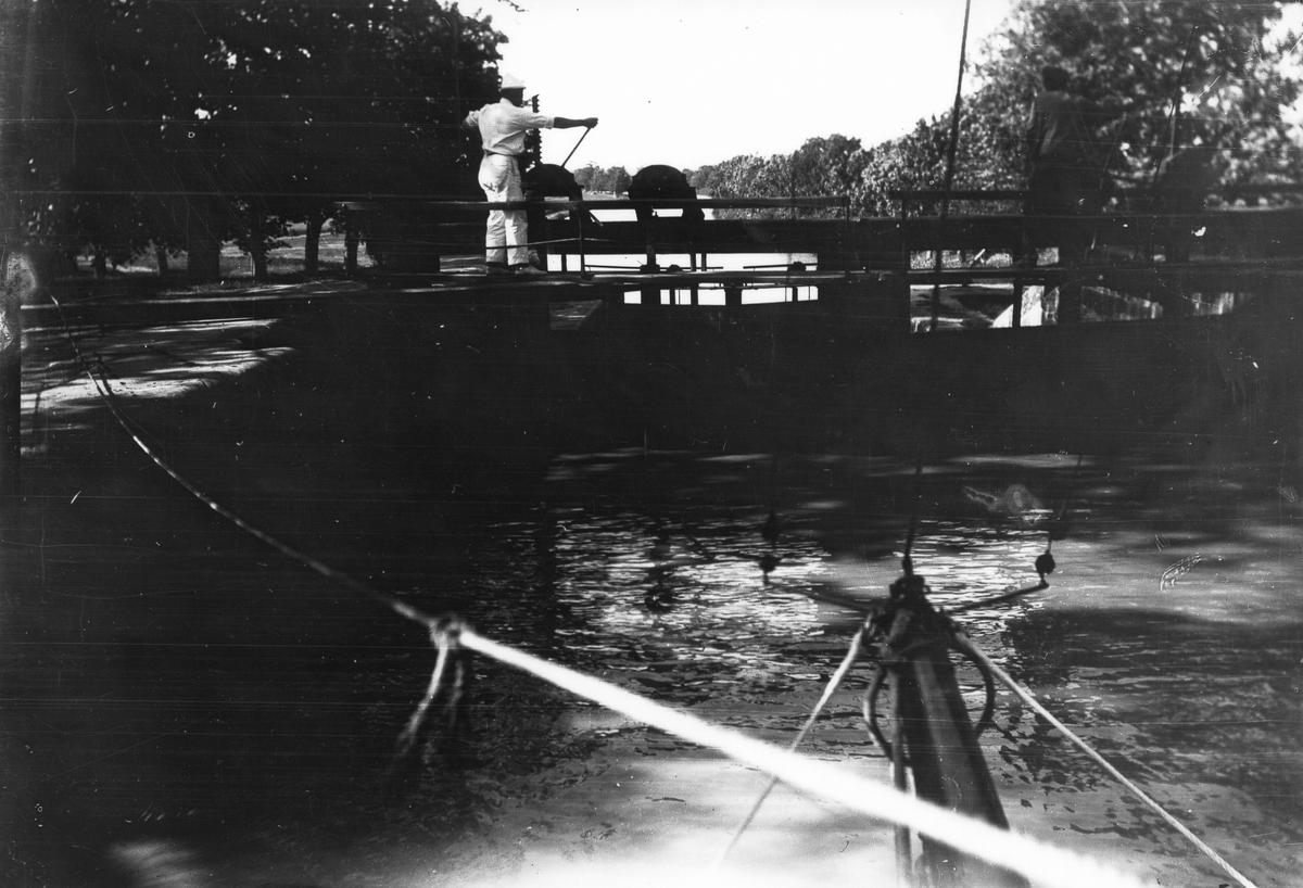 Besättningen hjälper till vid slussportarna, Göta kanal. Foto 1923.