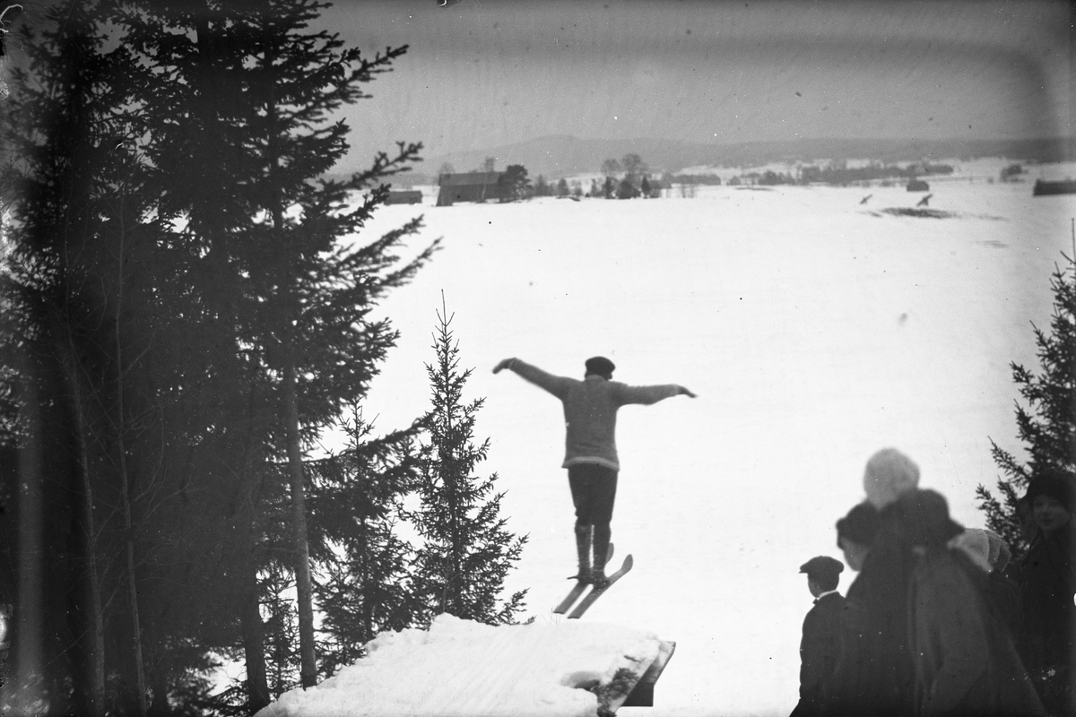 Hoppbacken i Bergströmshagen, skidhoppning med Enok Eriksson. Foto omkring 1915.