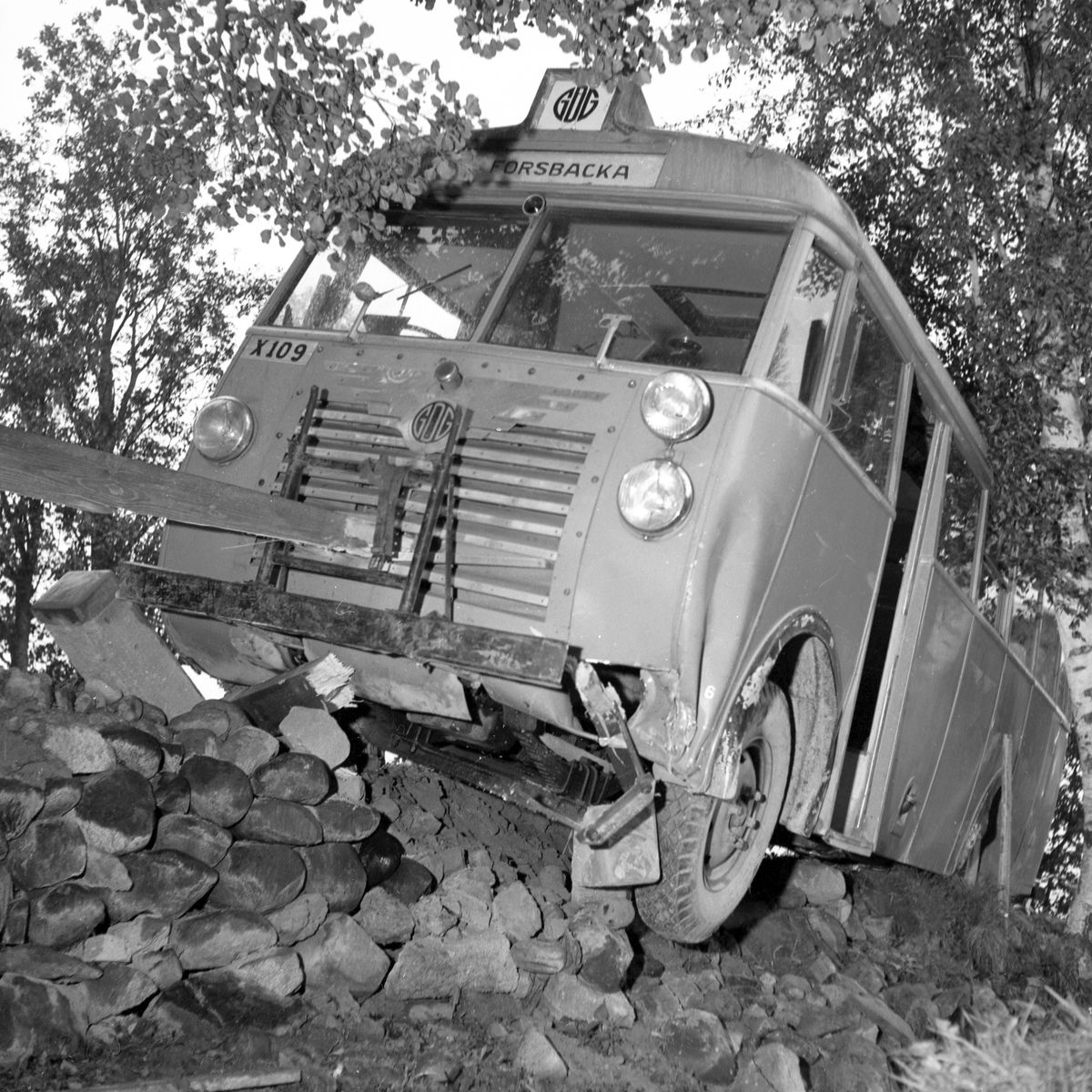 Bussolycka vid Hamrånge. September 1951. OBS! Det står Forsbacka på bussen.
