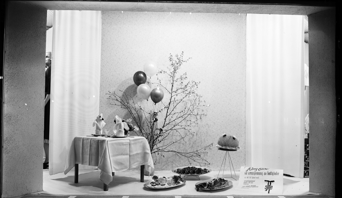 Konsum Alfa Varuhuset. Skyltfönstertema "Ring oss vi arrangerar"