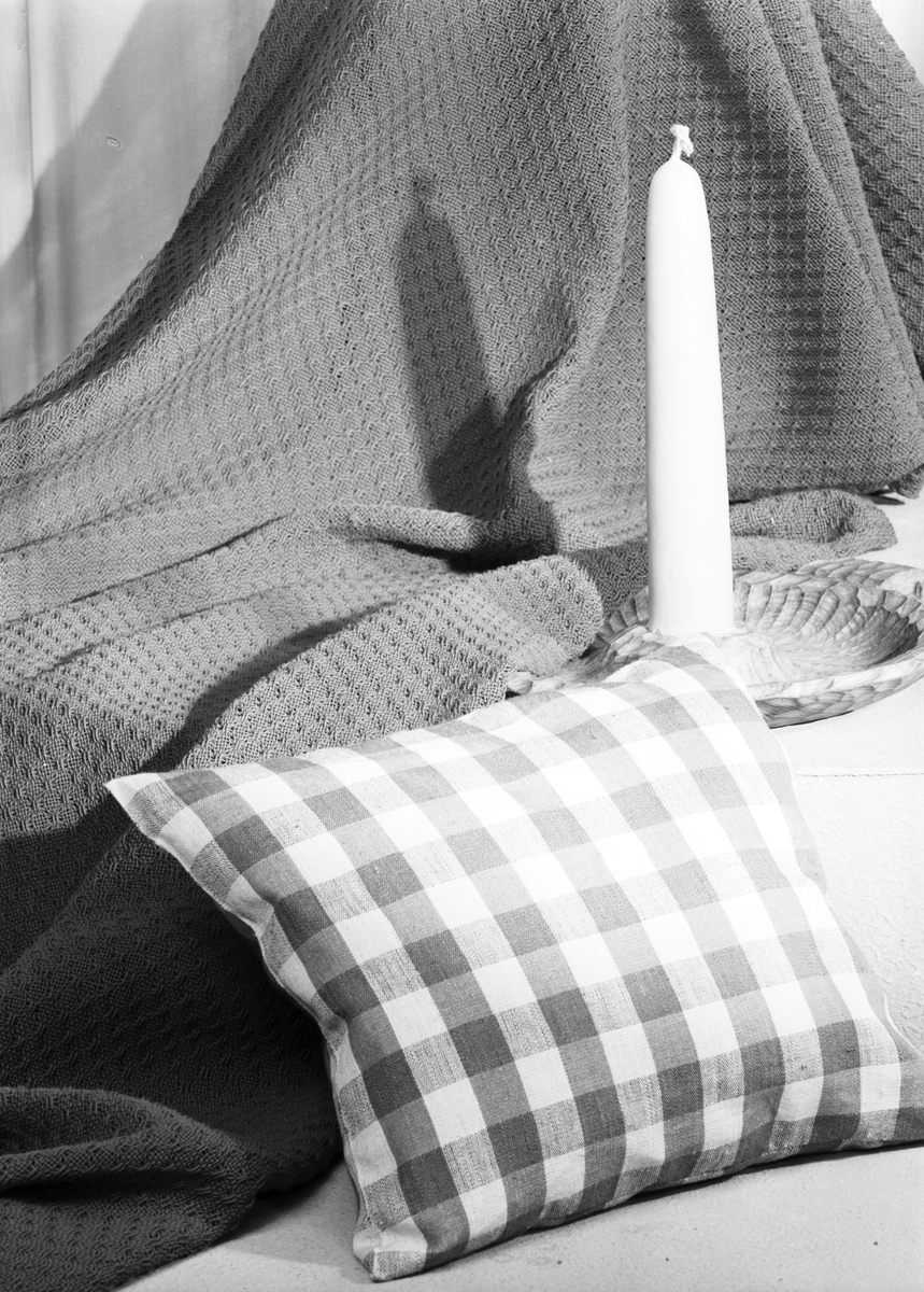 Gestrike Hemslöjd, kudde, vävt tyg, ljus och ljusstake