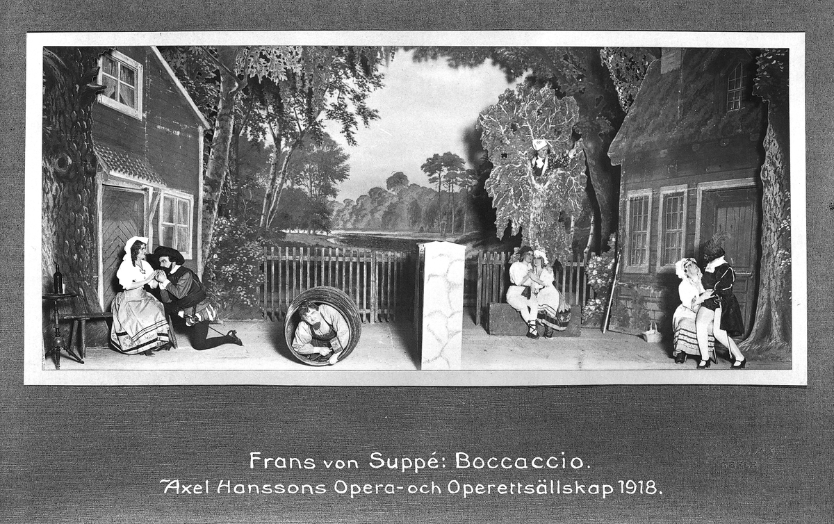 Frans von Suppé: Boccacio. Axel Hanssons Opera- och Operettsällskap 1918. Axel Hansson. Född 1869, död 1911. Franz von Suppé. Född 1819, död 1895. Österrikisk kompositör. Boccaccio operett i tre akter (1879). Handlingen utspelar sig i det medeltida Florens där poeten Boccaccios erotiska noveller orsakat skandal.