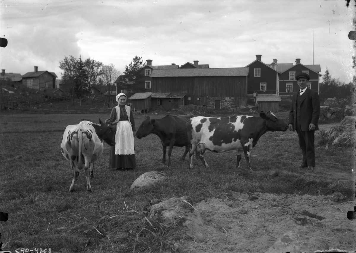 En man och kvinna med kor, bondgård i bakgrunden.