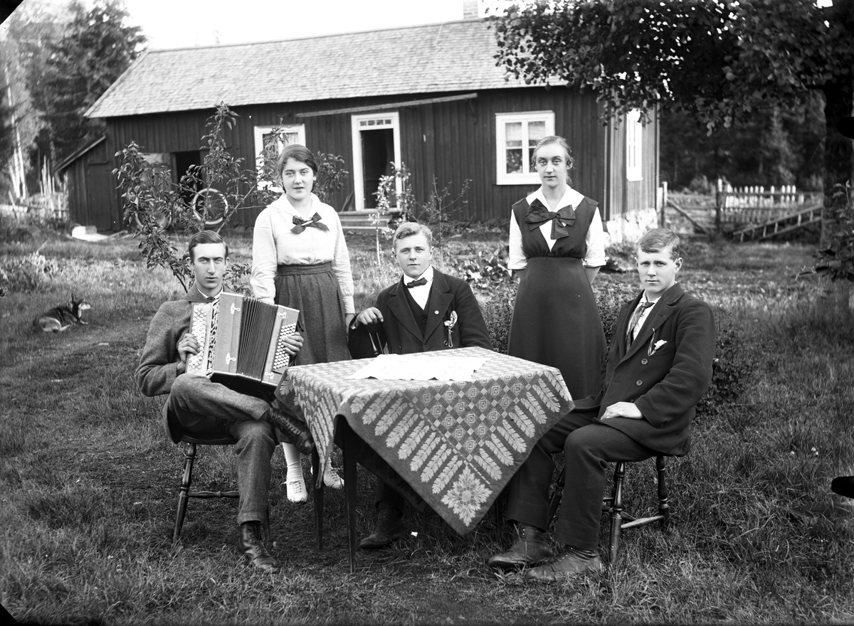 Fem personer i trädgården, en spelar dragspel. Från vänster: Halvar Stahre, Eda Stahre, Manne Sihlén, Hanna Sjökvist, född Stahre och Henning Sihlén.