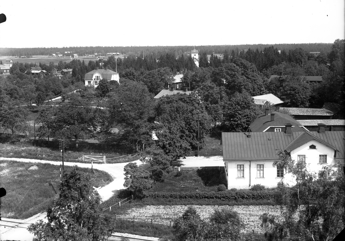 Vy över bostadsområde, Bergby. Längst fram till höger Bergby vita skola och bakom den gamla skolan. Den vita villan till vänster byggdes av Knut Persson och köptes av kommunen vid konkurs i början av 1930-talet och användes sedan som bostad åt bankkamrer Fasén och till kommunalhus.