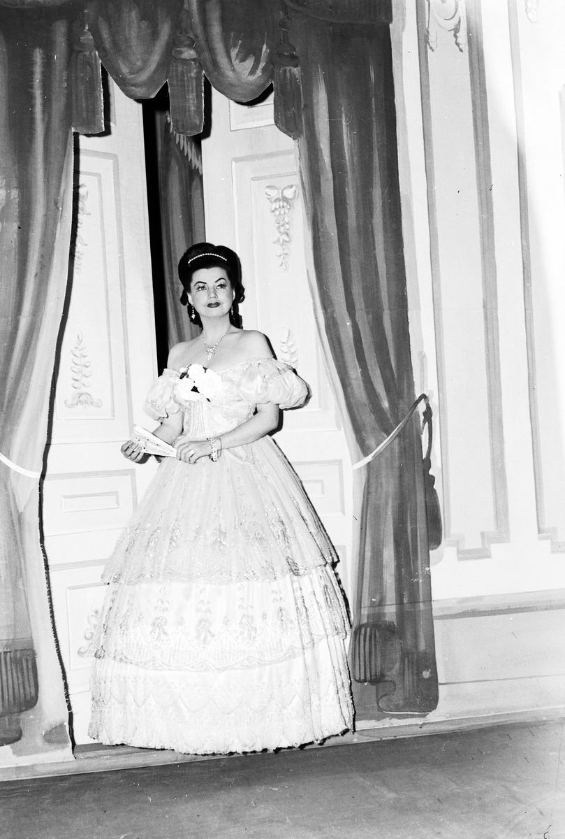 Titel: Operasångerska Dora Lindgren. Stadsteaterns turné " La Traviata". 6 november 1948. Taget på Gävle teater.