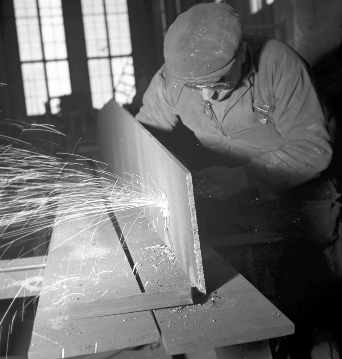 Svetsning pågår. Gävle Varv anlades 1873. Efter en konkurs 1921 bildades Gefle Varfvs och Verkstads Nya AB, som bland annat tillverkade oljecisterner och utrustningar till pappersmassefabriker. På 1940-talet återupptogs skeppsbyggeriet.