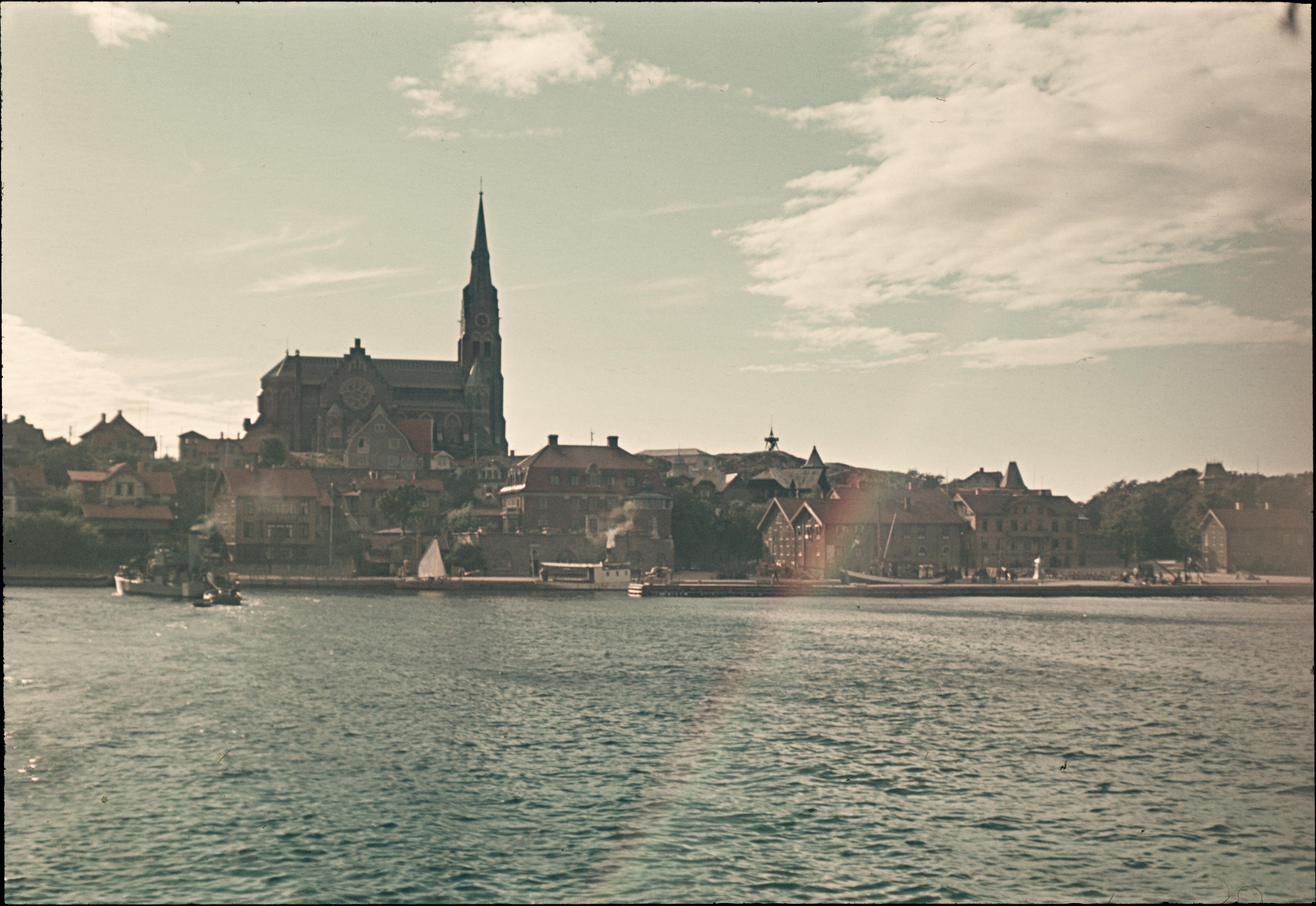 Södra Hamngatan och kyrkan, sett från en båt som far ut på Gullmarn.