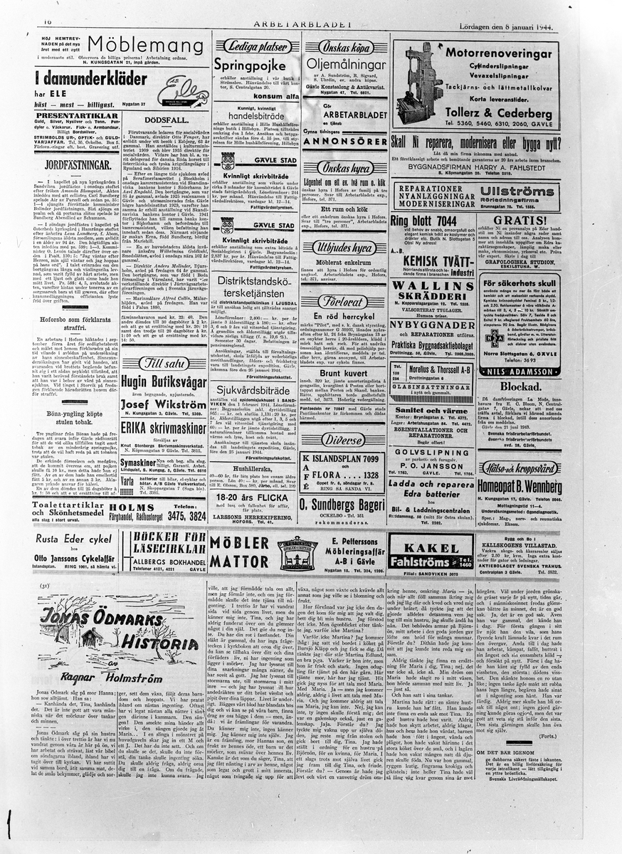 En sida av Arbetarbladet Lördagen den 8 januari 1944. Bland annat avsnitt ur "Jonas Ödmarks Histroria" av Ragnar Holmström