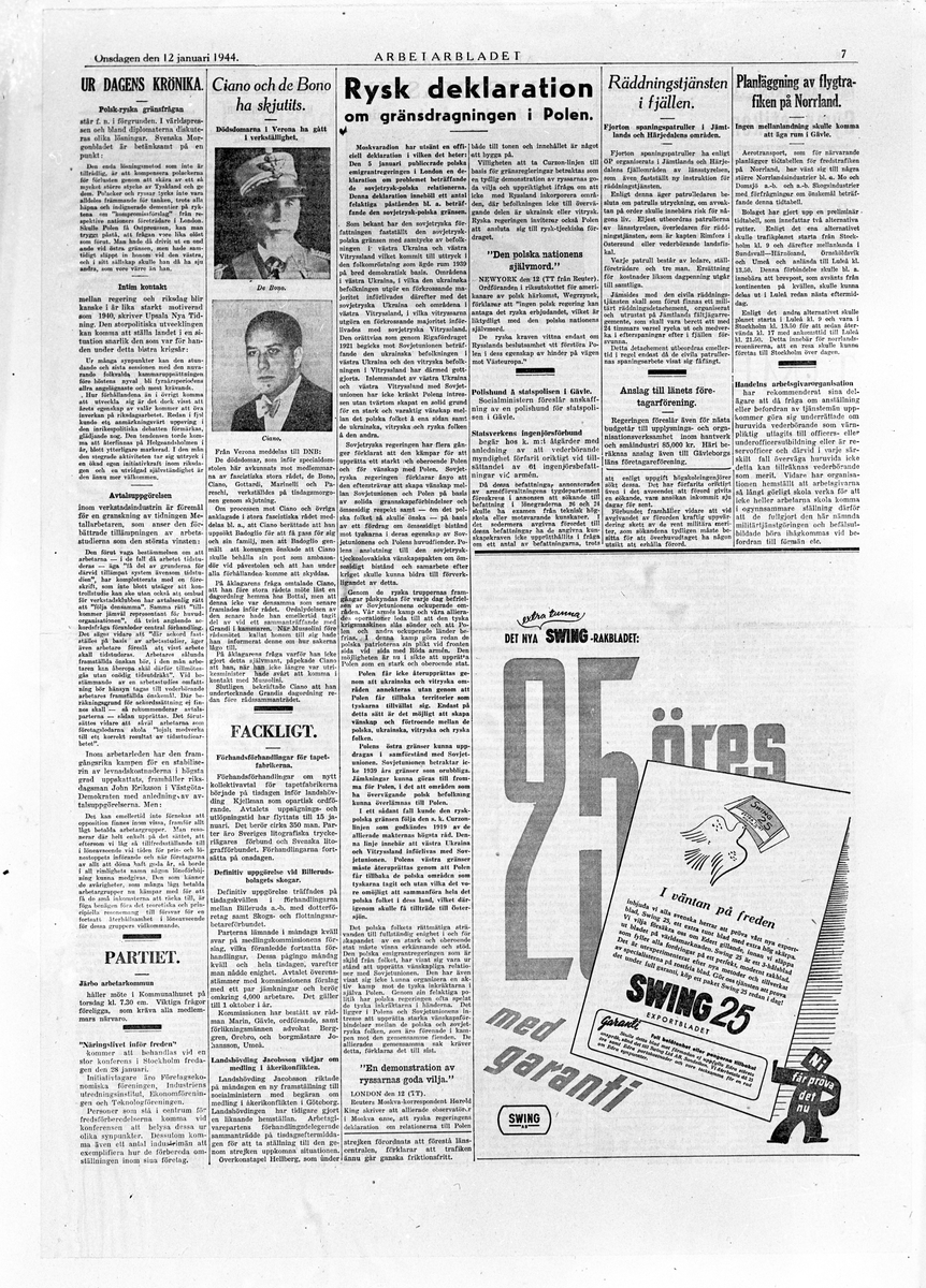 En sida av Arbetarbladet Onsdagen den 12 januari 1944. Bland annat "Dagens Krönika"