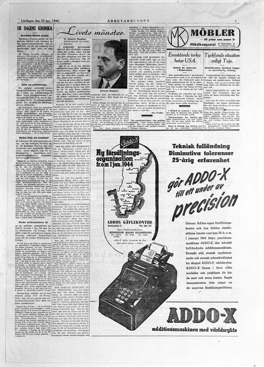 En sida av Arbetarbladet Lördagen den 22 januari 1944. Bland annat "Dagens Krönika"