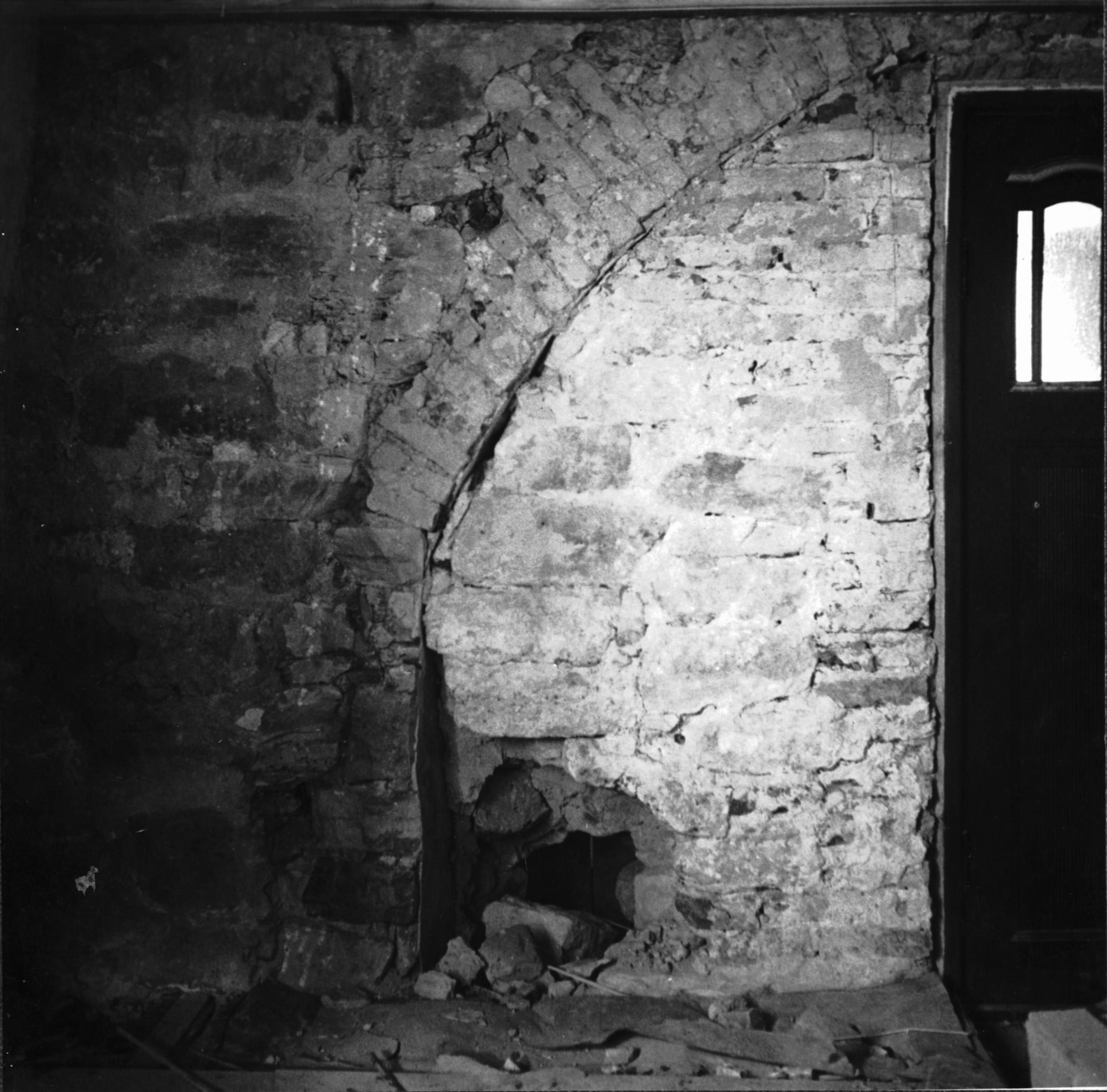Södra delen av bågöppningen mellan långhuset och tornets bottenvåning, ännu ej öppnad, sedd från långhuset.