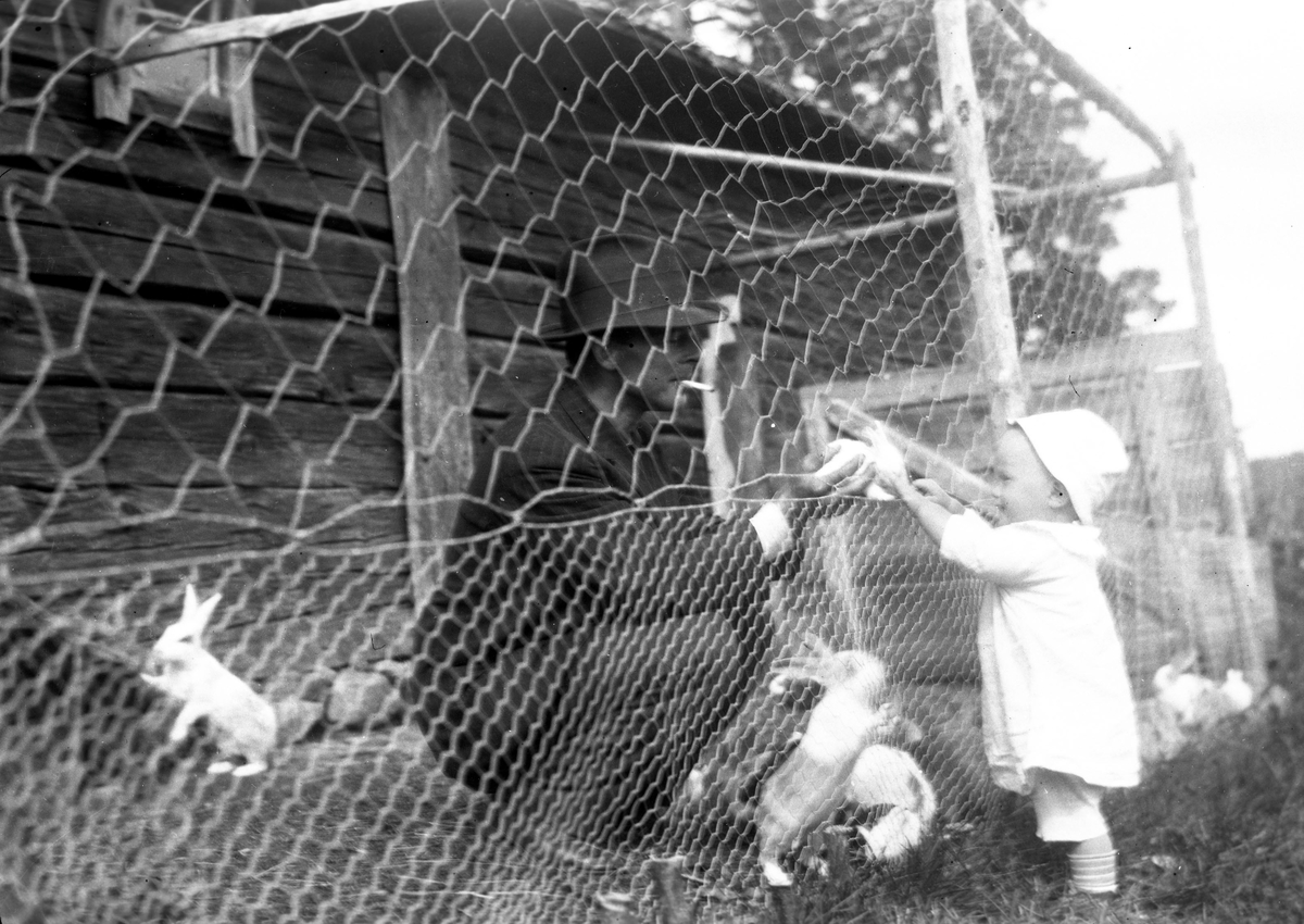 Sören Brundin, 2-3 år, hälsar på en farbror som hade kaniner.