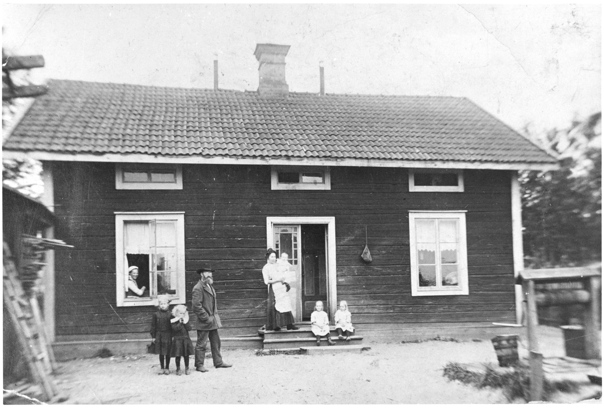 I fönstret. Maria Jönsson, stående fr.v. Naima Jönsson, Hildur Jönsson, Johannes Jönsson. Stående på bron Svea Jönsson.