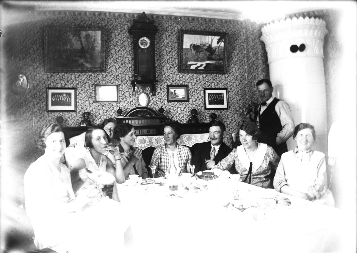 Hemma hos familjen Karl Johan Östergren (fotograf). Längst till höger fotografens hustru Lovisa Kristina Östergren och stående vid kakelugnen fotografen själv.