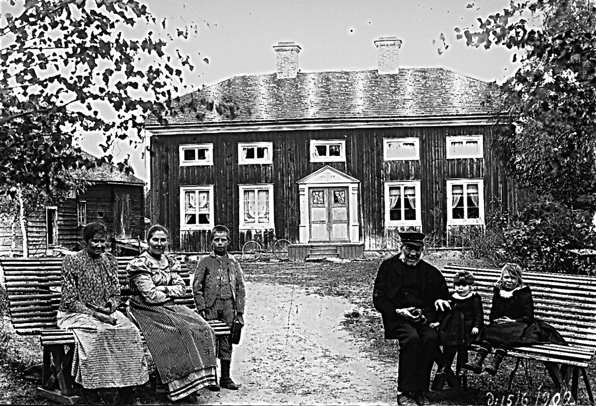 Östansjö, "Lindbergs" i bakgrunden. Personerna från vänster: Kerstin Östlin (Annas mor), Anna Lindberg, Per Herman Lindberg, Johan Erik Lindberg, Elvira Lindberg och Ester Lindberg. Foto den 5 juni 1902.