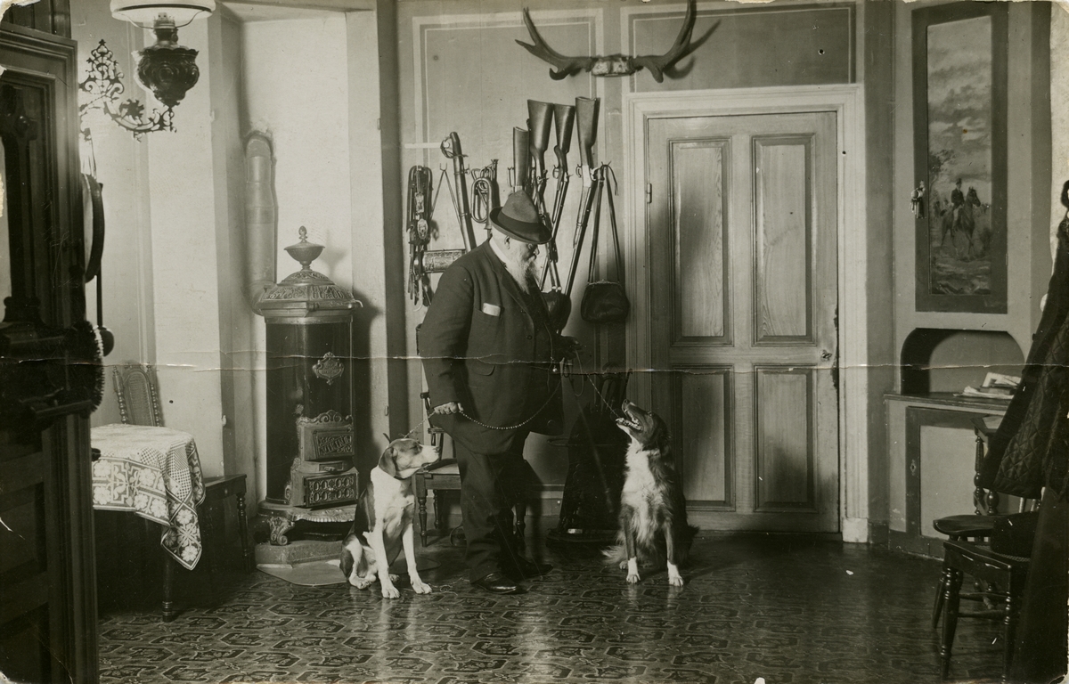 Trafikchefen för DONJ (Dala-Ockelbo-Norrsundets järnväg) August Westerlund (1853-1920) med sina jakthundar i tamburen i Jädraås herrgård.