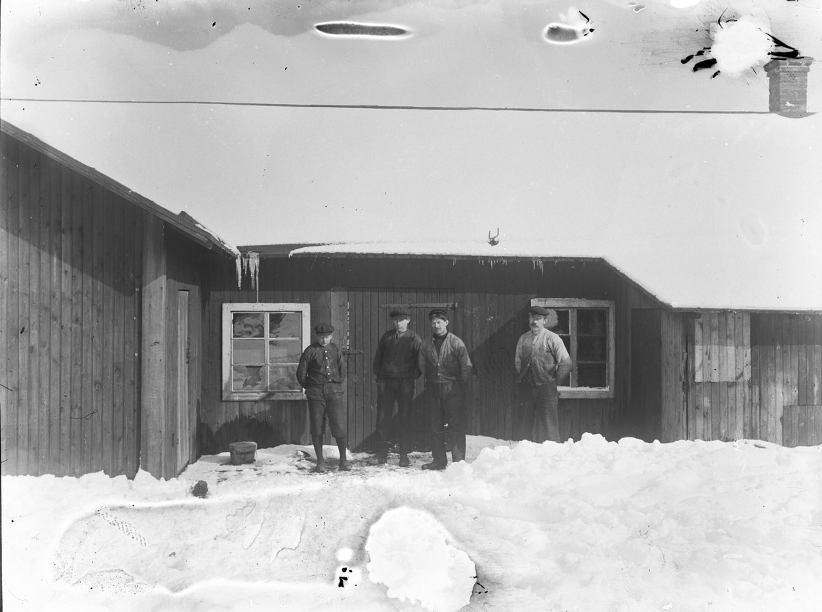 Bröderna Sahlin utanför Smides och Reparationsverkstad. Vinkelbyggnaden till vänster var hovslageri, den mittre delen smedja och den högra cykelverkstad. Det var tidigare Wikholms Smidesverkstad, Hästboheden. Omkring sekelskiftet hade A. Wikholm tillverkning av plogar, harvar och diverse redskap, flyttade tillverkningen till Ockelbo (1904?) där den utökades. Där tillverkades den kända Wikholmsplogen som var mycket bra för gräsvallar.