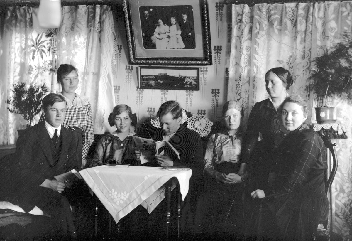Fr.v. syskonen Yngve och Signe Tjernld, Enok Eriksson, Betty Eriksson samt några okända personer. Hästbo, Torsåker.