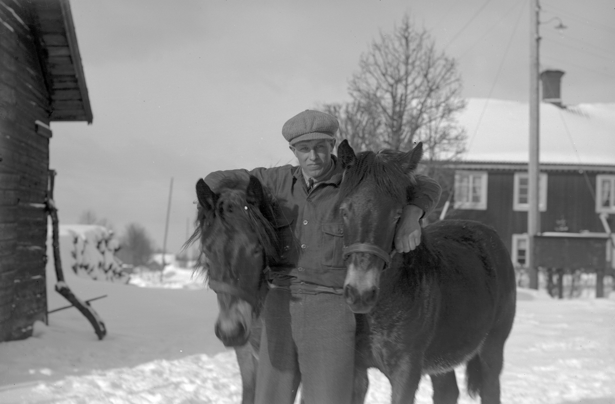 Vintermotiv från "Erik-Lars", Hästbo. Man med två hästar.