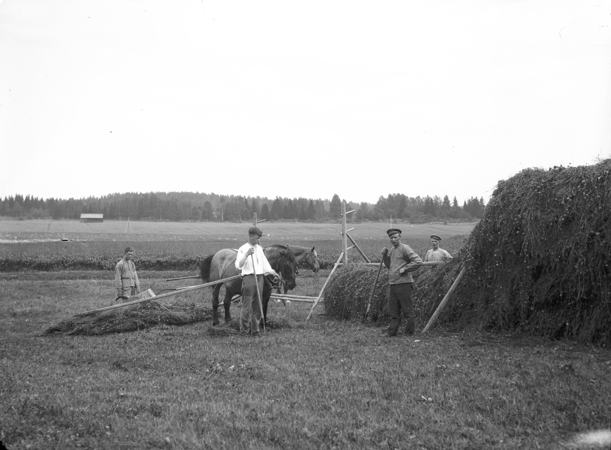 Åsmundshyttan nummer 9 "Erik-Anders". Åkern nordost om gården som från vänster Arnold Jönsson, Joel Hansson, Per Hansson och Oskar Andersson arbetar. Hästarna Flora och Jonas går i skaklarna