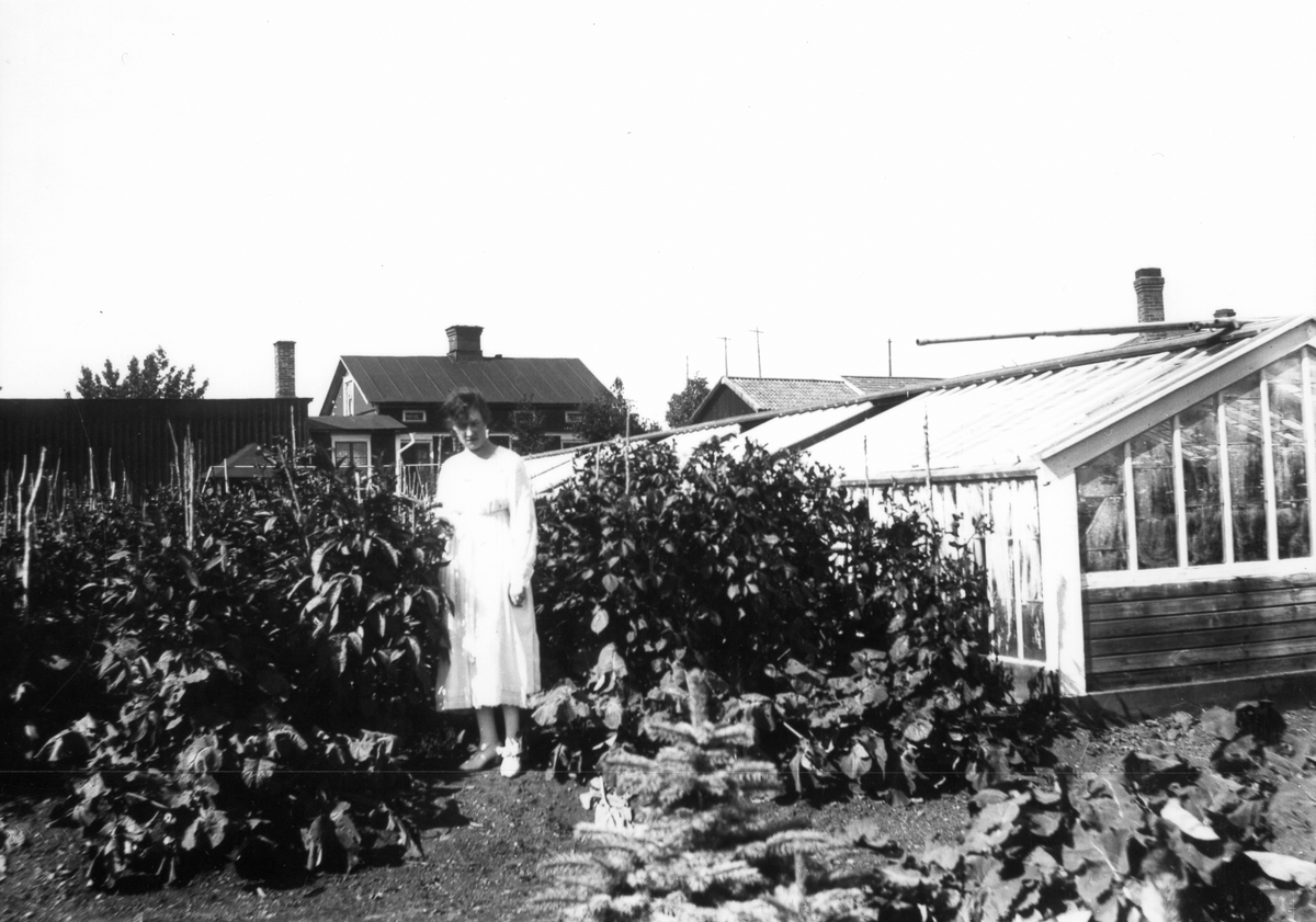 Växthusanläggningar, kvinna poserar i förgrunden.