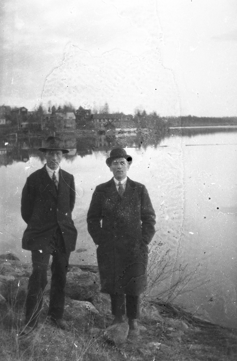 Två män vid sjö.