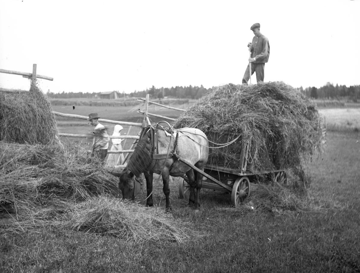 Hö körs in Oskar Andersson lastar Joel Hansson trampar. Anna Hansson räfsar. Inkörning av hö med häst och vagn som har järnhjul. Bilden finns med i Torsåkers Fotohistoriska Sällskap. Bild 4:7